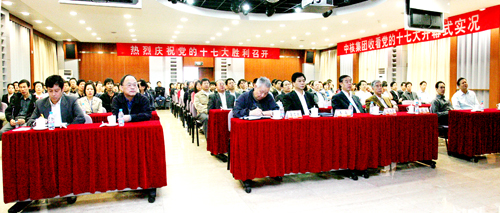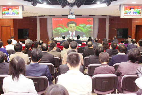 虽然因为人员太多而略显拥挤,但整个会场却非常安静,就连每逢会议难免嗡嗡作响的手机似乎也绝了声。大家都在认真地倾听,有的详细地做着记录,有的还时不时地将身子轻轻探起,生怕错过电视里传出的只言片语……10月15日上午,中核集团公司党组成员、副总经理孙又奇,党组成员王森,以及老领导赵宏、李忠良、钱福源等与集团公司总部、档案馆、金原铀业公司、新闻宣传中心、二二一局的干部职工一起收看了中共十七大开幕式的现场直播,聆听了胡锦涛总书记所作的报告。