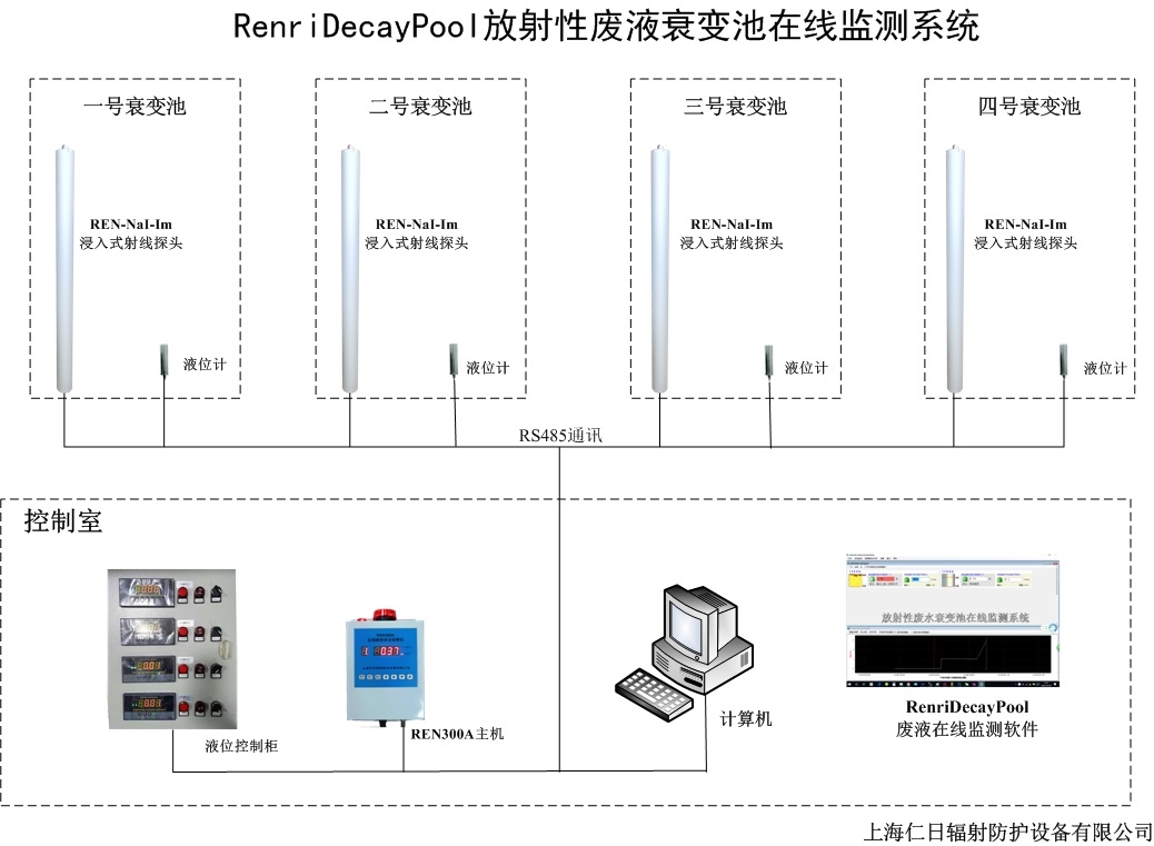 本系统是以工控机或商业台式计算机作为上位机,以若干液位测控仪和若干REN300在线辐射安全报警仪及射线探头为下位机,通过屏蔽电缆线组成一个RS-485通讯网络。在线监测系统软件是整套系统的大脑,由其完成全部系统的自动化控制过程。